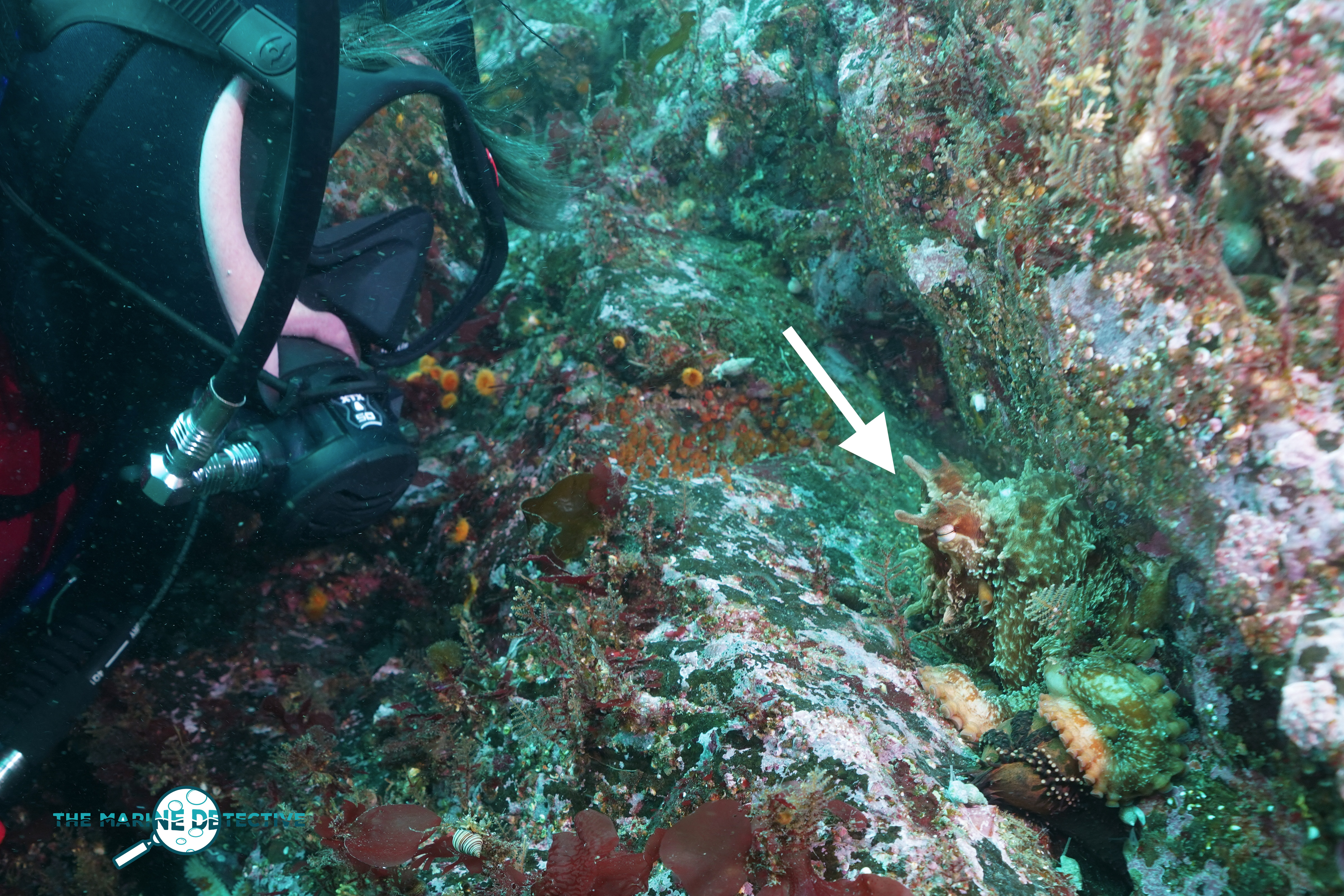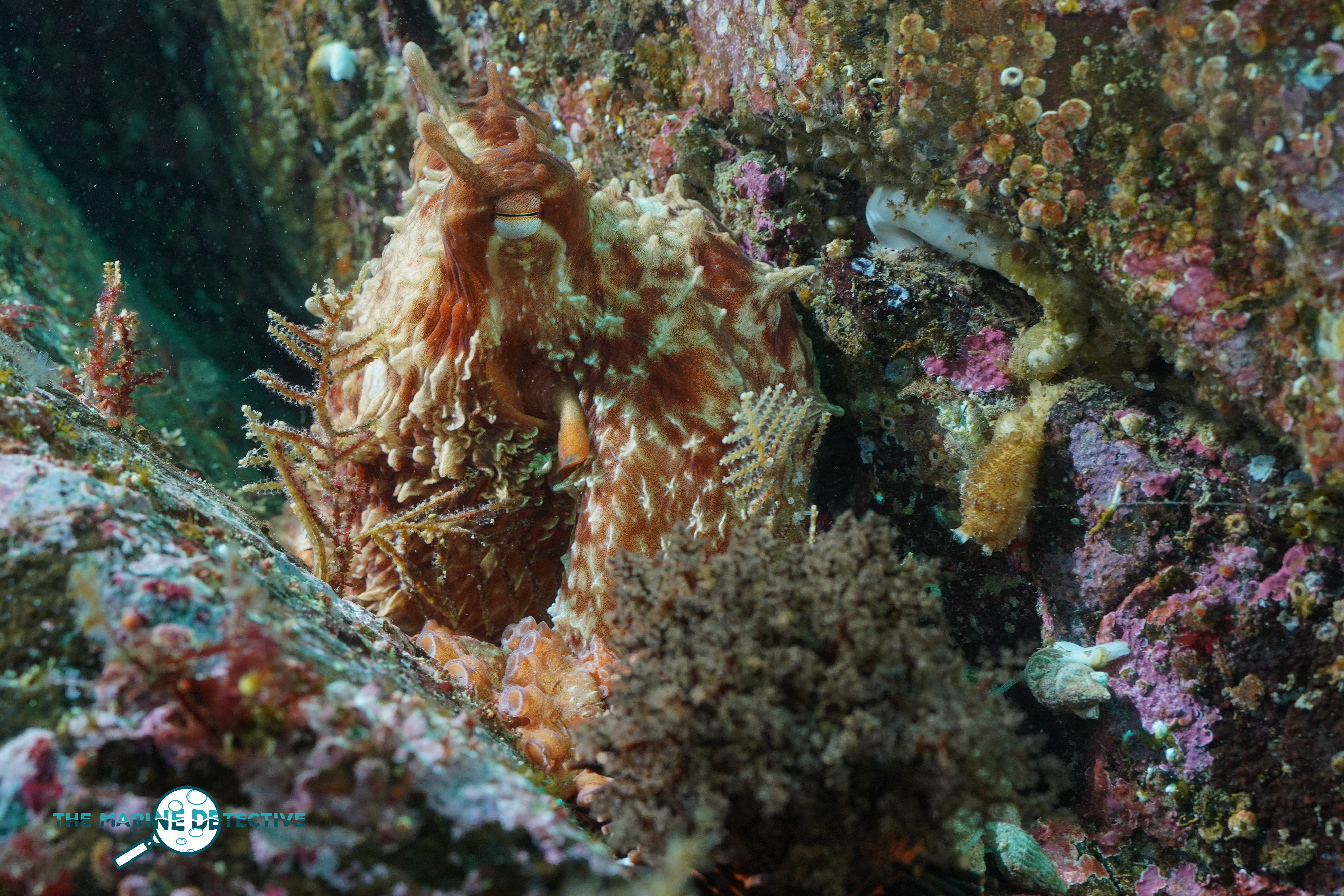 Her colours change, flashing white at times. Then, again camouflaged among the boulders covered with the pink of coralline algae species, and studded with Orange Cup Corals and the plumes of feeding tentacles of Orange Sea Cucumbers.
