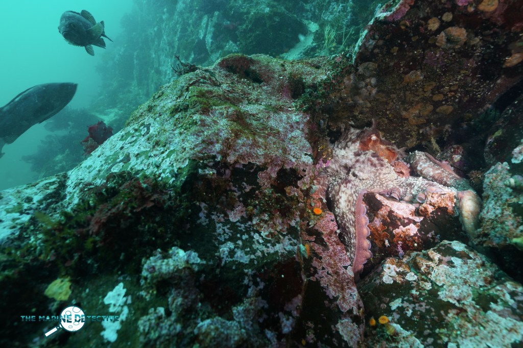 See the Copper Rockfish on the right? This fish was following this female Giant Pacific Octopus around as she hunted.