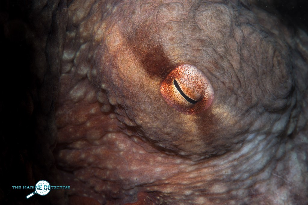 Note too that octopuses do not have eyelids. They have have a ring-shaped muscular fold of skin around the eye that closes in the way of an eyelid (especially when some annoying human is taking photos).