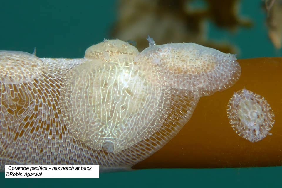 Note there is a second similar looking cryptic nudibranch that can found on these bryozoans and that is Corambe pacifica. Corambe pacifica has a notch at the back. Corambe steinbergae does not.