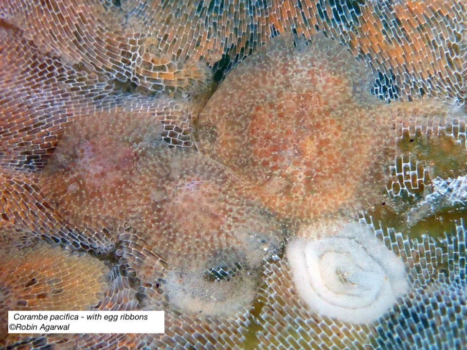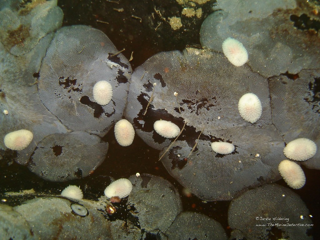 From Invertebrates of the Salish Sea: “Bryozoans start from a single individual zooid (an ancestrula) which repeatedly reproduces asexually to form a colony. In this species, the oldest individual is in the middle. Colonies of this species usually begin to be noticeable in late spring and grow through summer into fall. By fall they may form extensive crusts on the kelp and many colonies have merged with one another. In many bryozoans there are various types of zooids but in this species there is only one type of zooid which serves for feeding, for reproduction, and for defense. The colony appears to be a simultaneous hermaphrodite, or male zooids may develop first. They do not brood their young. Eggs are fertilized then released, and quickly develop into cyphonautes larvae which may feed and develop as plankton for several months. The larvae settle when they encounter kelp such as Laminaria or water with an excess of potassium ions. The small white nudibranch Doridella steinbergae [reclassified to Corambe steinbergae] may be found living and feeding on these colonies but it blends in so well it is difficult to see . . .”