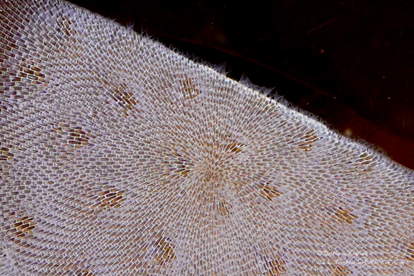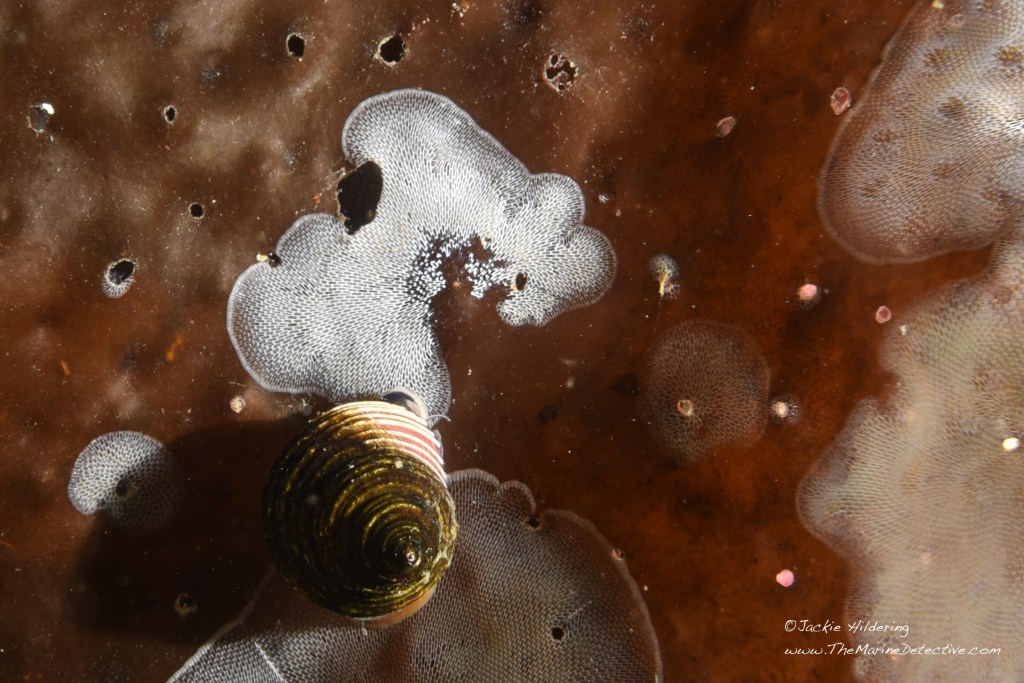 From Beachkeepers: “Bryozoans are colonial animals that arrange themselves in circular (radial) fashion, often with the oldest (and first to settle) individual in the middle. . . . The ‘box’ of the zooid is made of either a tough protein (like what you would find in crab shells) called chitin, or what you would find in coral reefs, calcium carbonate. This body box has an opening where the bryozoans extend their feeding apparatus (that looks a lot like a sea anemone) called a lophophore. Yes, they have predators! [Some species of] nudibranch will eat them, though they can reproduce asexually to form the colony back to size after a nudibranch has been grazing on them. Sometimes, when they grow back, they’ll even grow chitonous spines on their body walls to discourage the nudibranchs from coming back. These spines usually form on the individuals on the outside edge of the colony.”