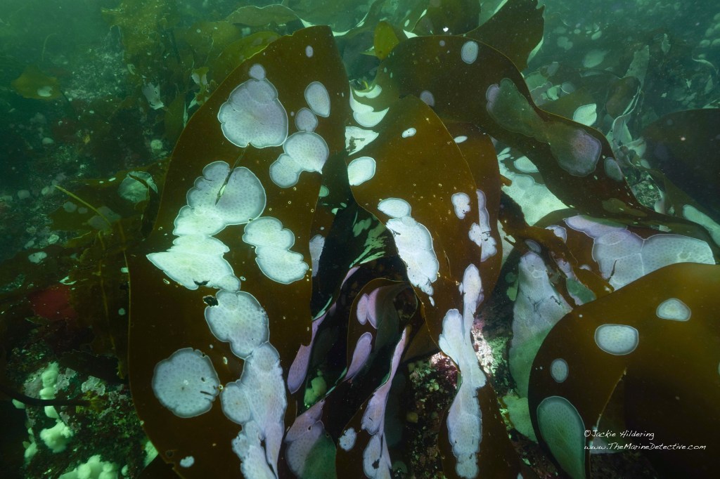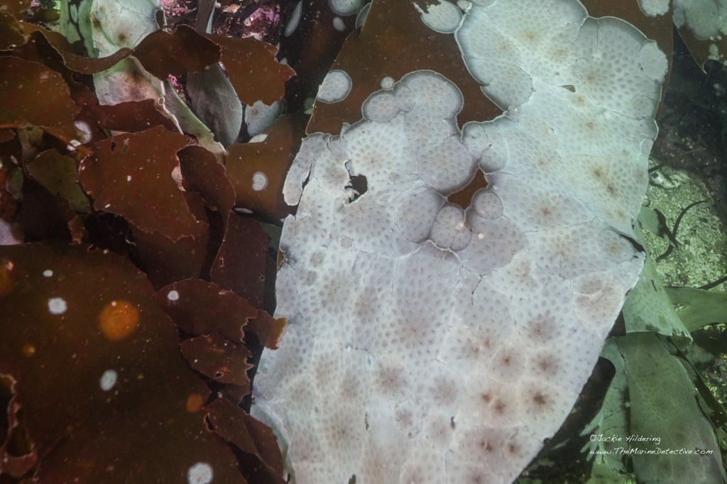 It’s the time of year when the annual kelps like Bull Kelp begin to break down. It’s then that Kelp-encrusting Bryozoans really get a chance to colonize the kelp as you see in these photos.