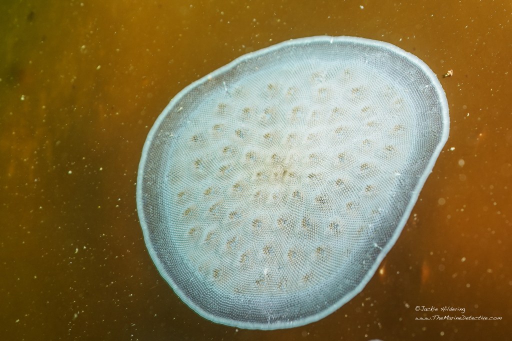 “Kelp-encrusting Bryozoan” (Membranipora membranacea) is also known as “Kelp Lace Bryozoan”. It’s no mystery how either common name was inspired. Each circular colony is approximately 20 cm wide.