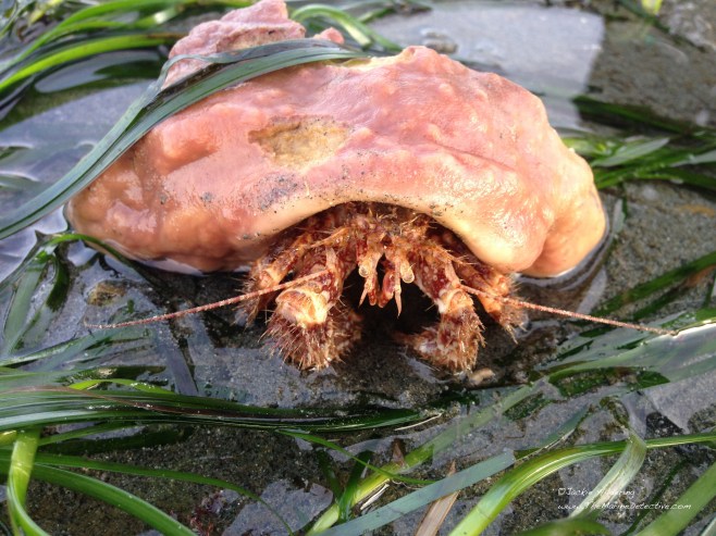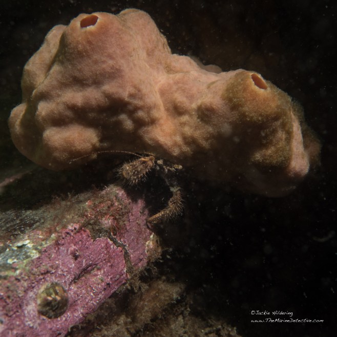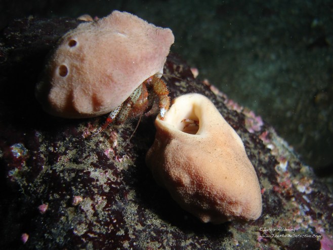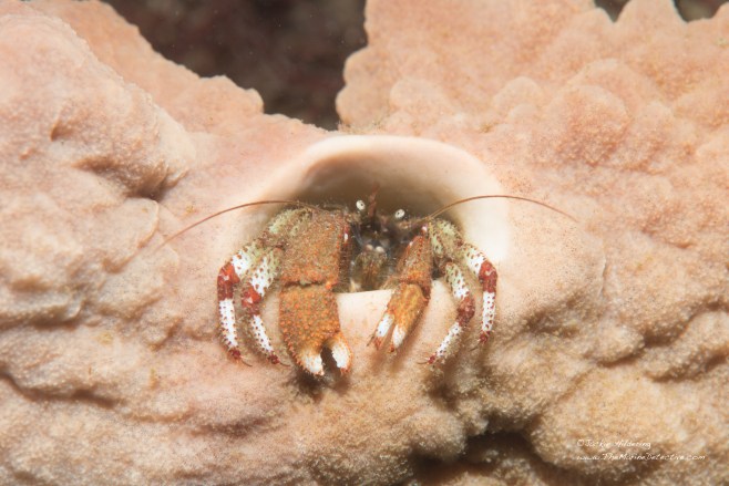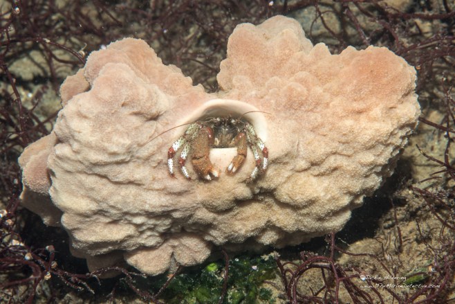 Note too how all the hermit crabs included in this blog have one claw bigger than the other? This is the case for many hermit crab species and it allows them, when they retreat into their home, to seal off the opening to the shell or sponge with the bigger claw. They close the door to their home.