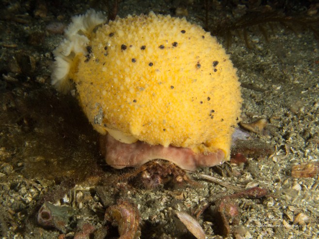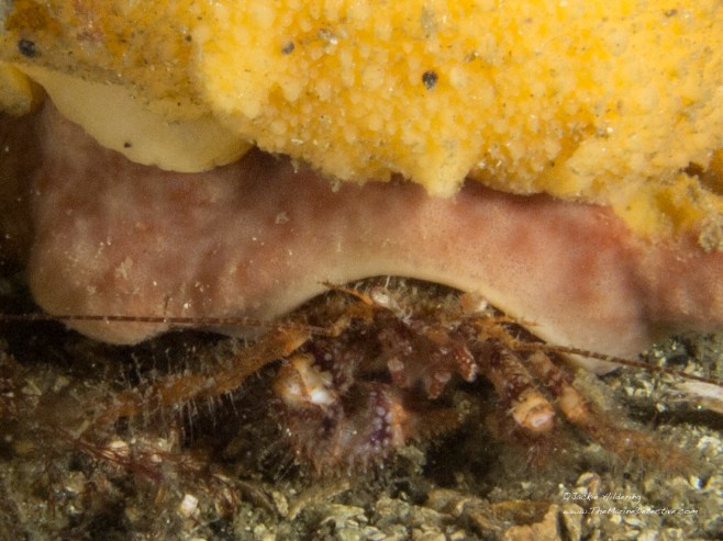 From top to bottom: the big yellow animal is a Monterey Dorid (nudibranch species – gills are on left). This nudibranch is feeding on the Hermit Crab Sponge (tan colour) and then, see the tiny face? That’s a Mud Hermit Crab who isn’t going anywhere for a little while (Pagurus capillatus to 4 cm).!