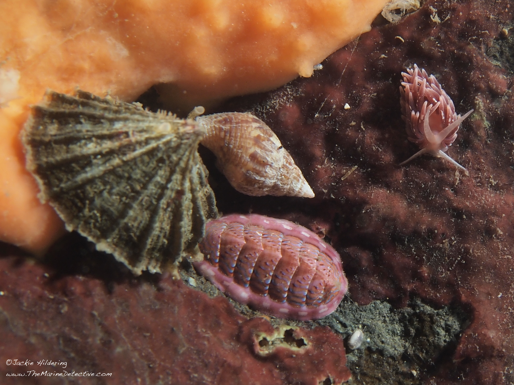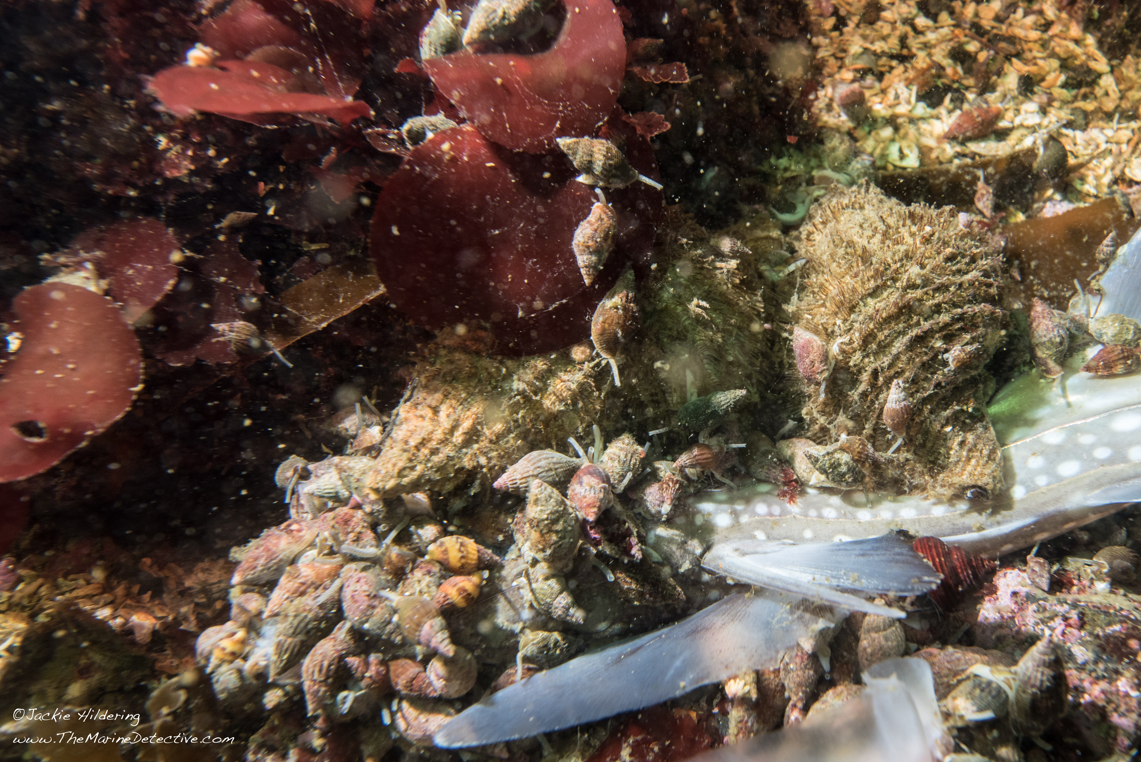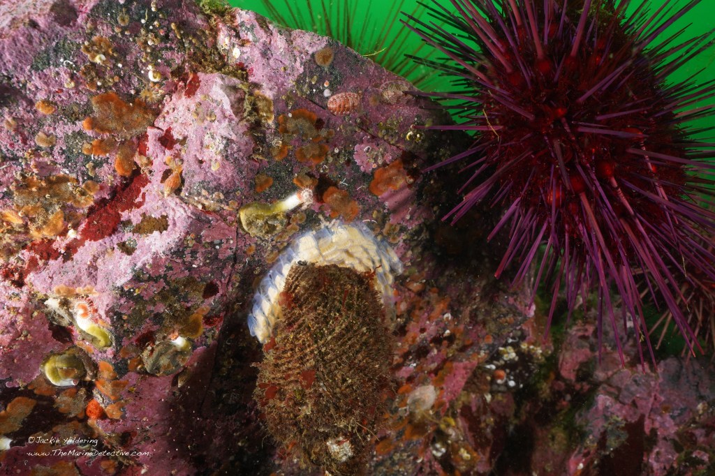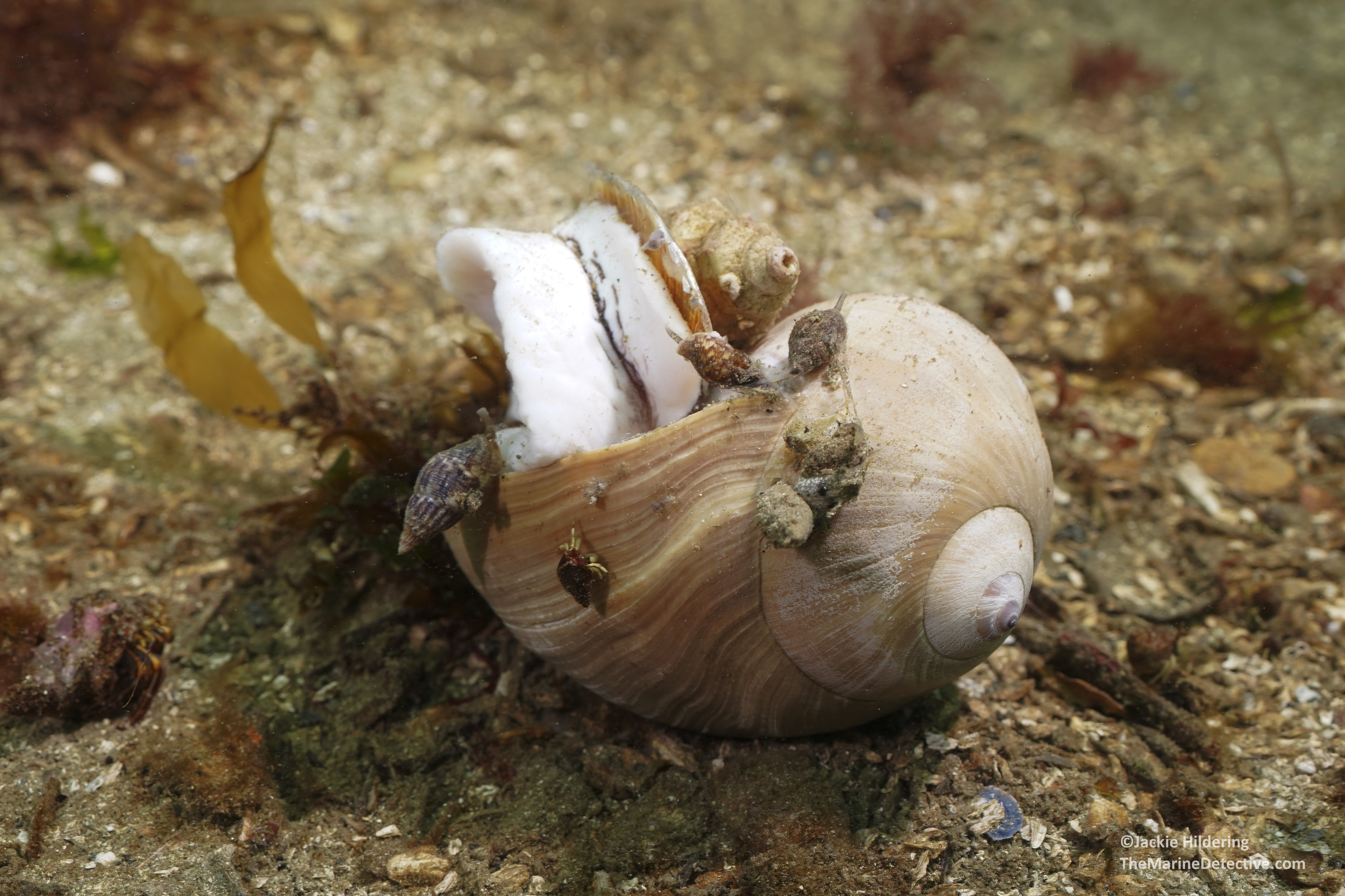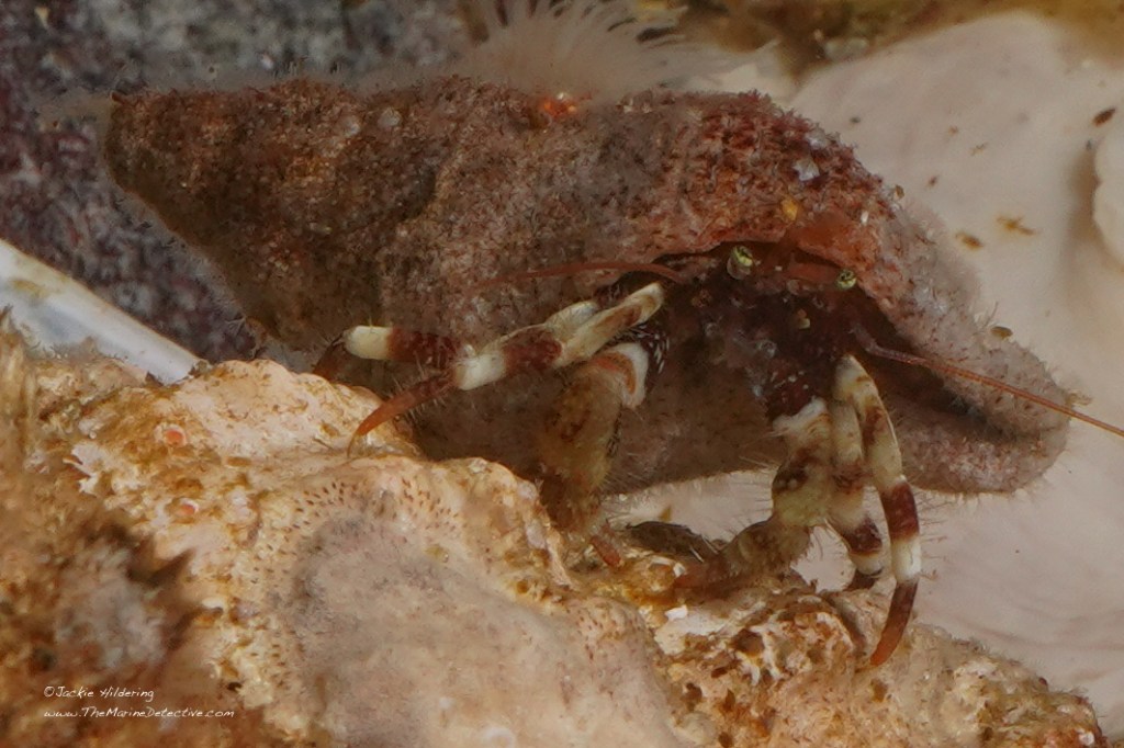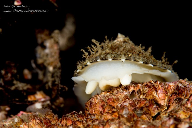 They are also known as the Hairy Triton. “Hairy” for the bristly “periostracum” you see atop the shells which appears to stop attachment of marine organisms. Some loose this bristly covering and, resultantly, can have a lot of settlement and growth on their shells.