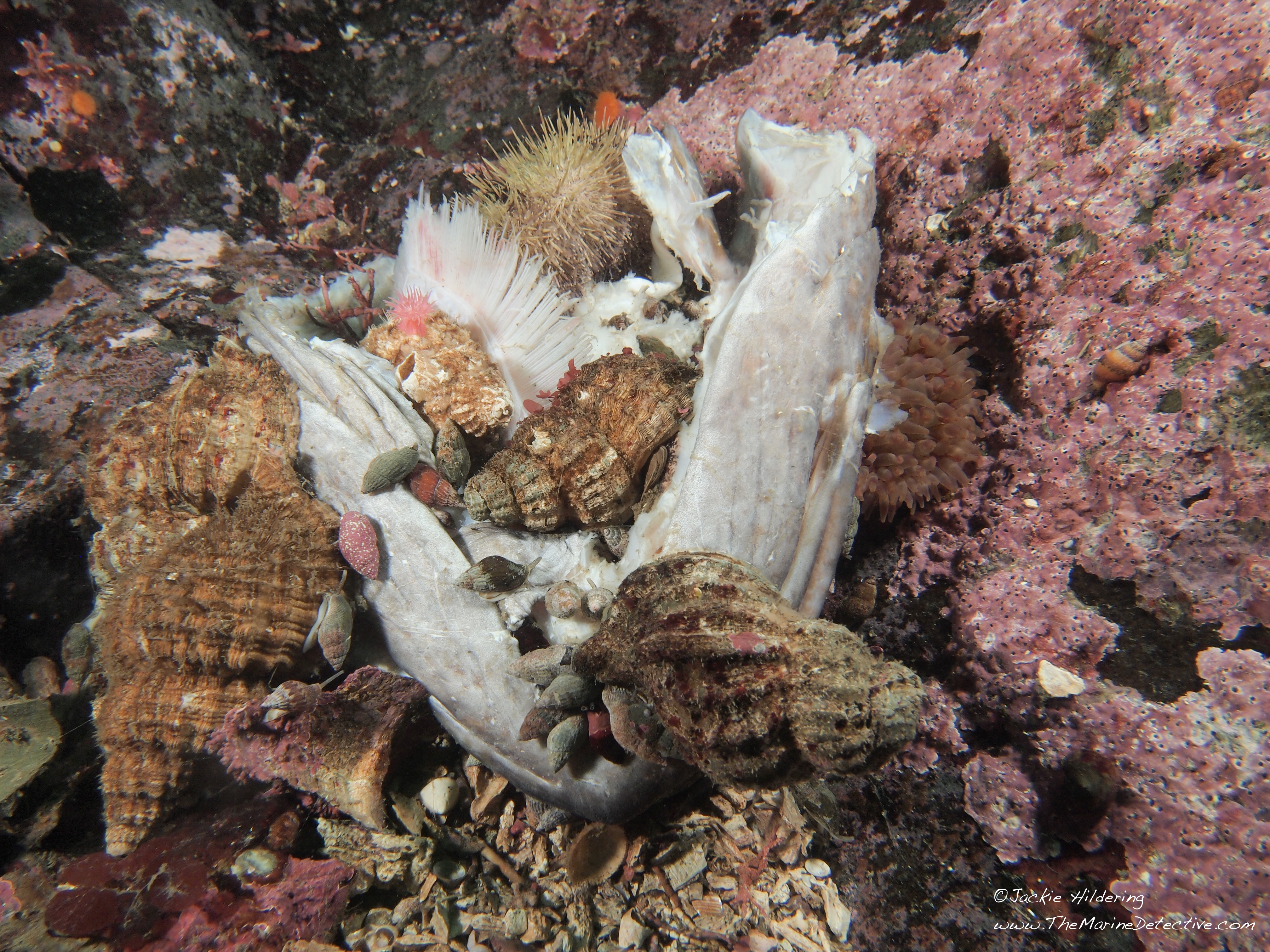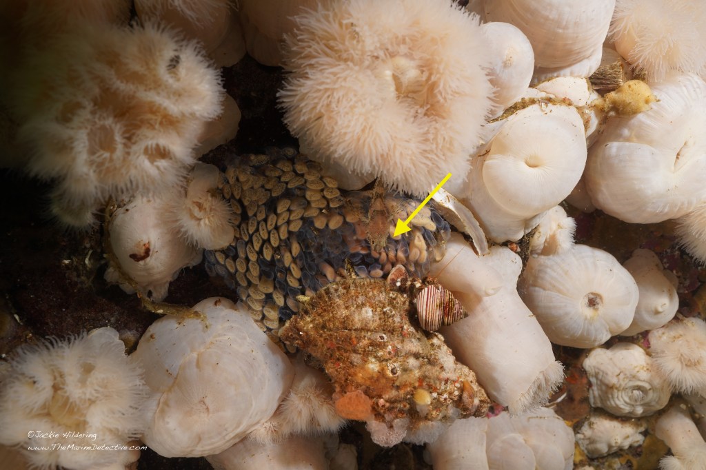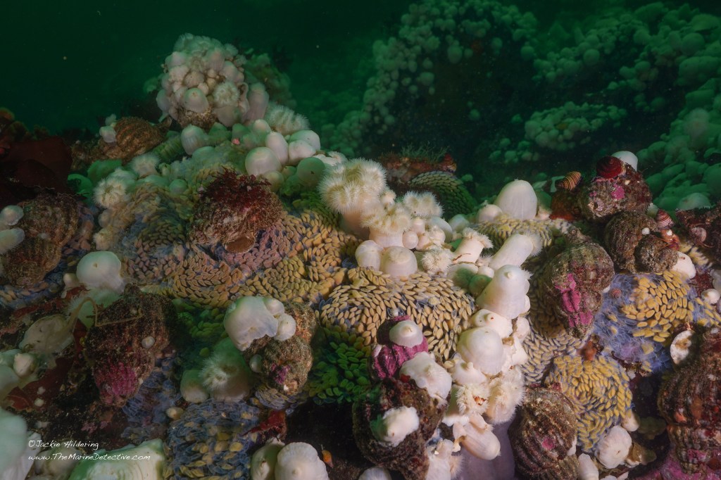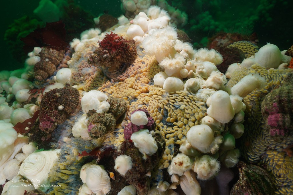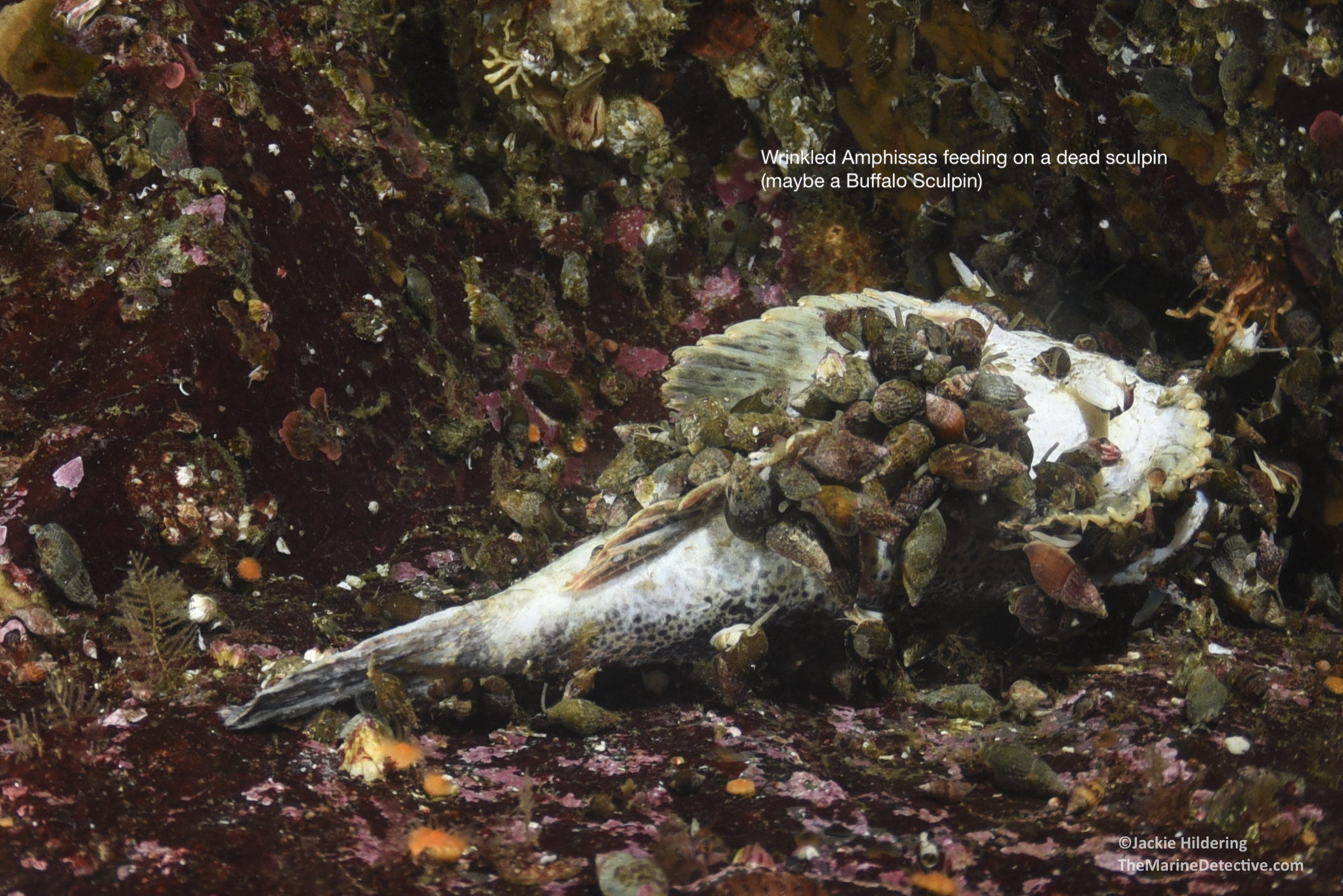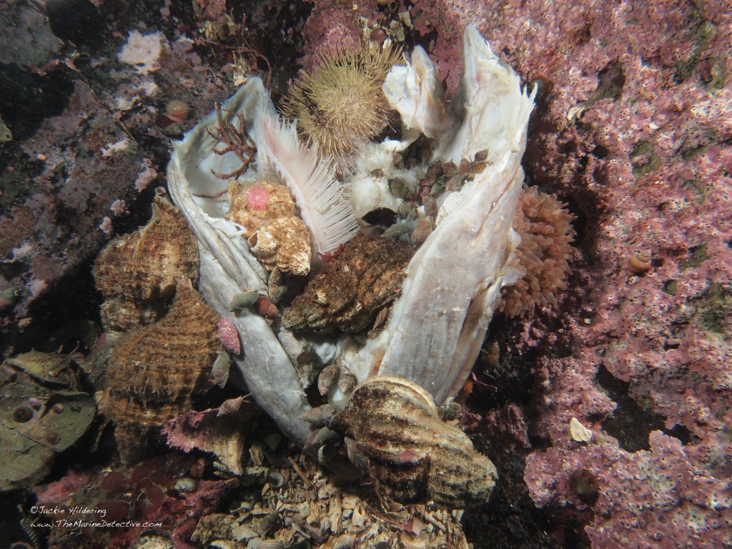I have also seen this species scavenge on dead crabs, anemones and fish and eat Lingcod eggs.