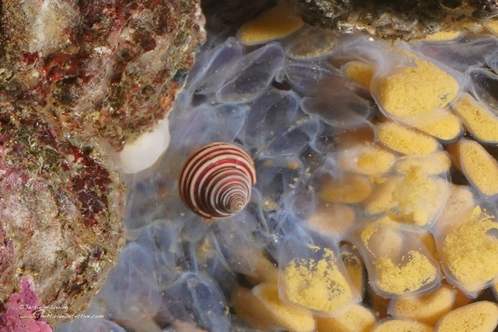 See the “blank” egg capsules? They have likely been preyed upon e.g. by shrimp, hermit crabs or other snail species. You can even see hermit crabs and snails in these images feeding on the eggs. Some hermit crabs are even sitting on females as they lay eggs. Oh the cheek!