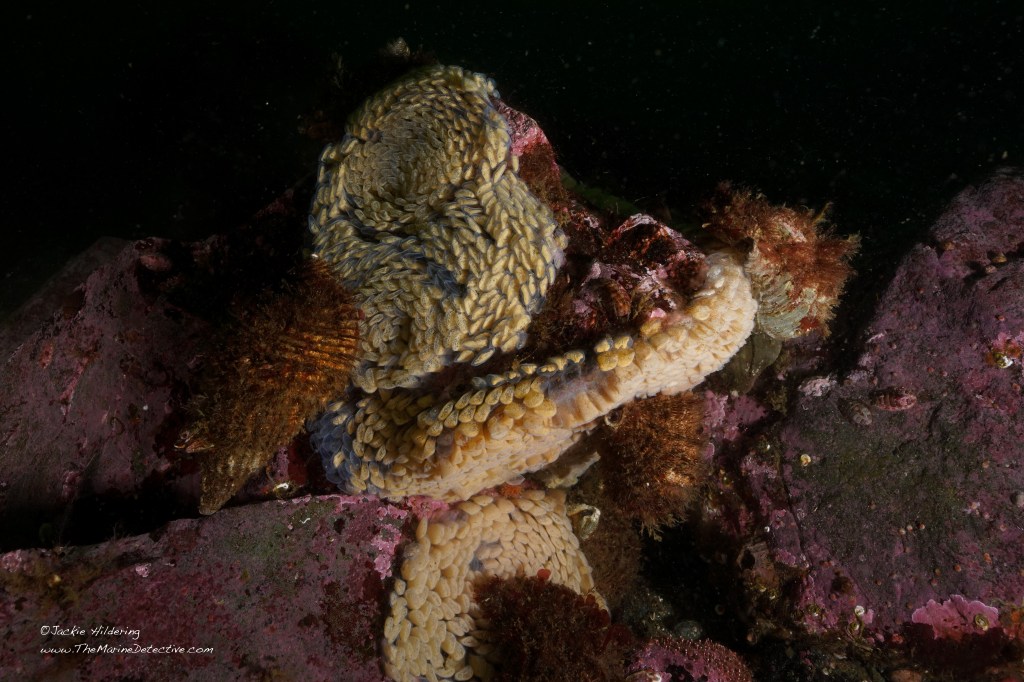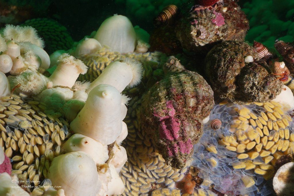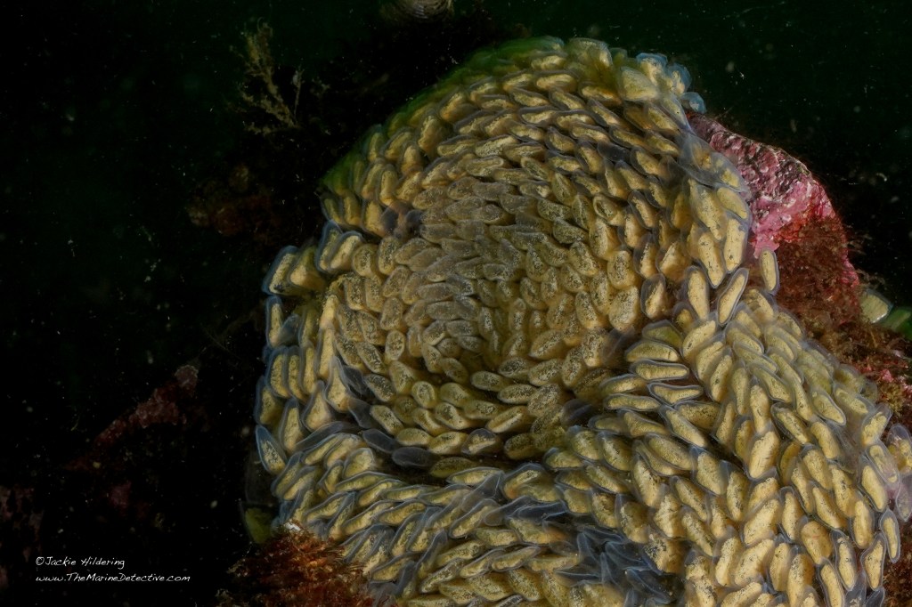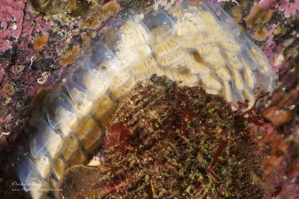 Look at how many fertilized eggs are in each “capsule” and marvel at the shape of the egg mass. These capsules are referenced as “sea corn” for this species. It takes each female about 2 weeks to lay her eggs in this wondrously shaped clutch. A friend referenced the shape of the egg mass as being reminiscent of Van Gogh’s “Starry Night”. Agreed!