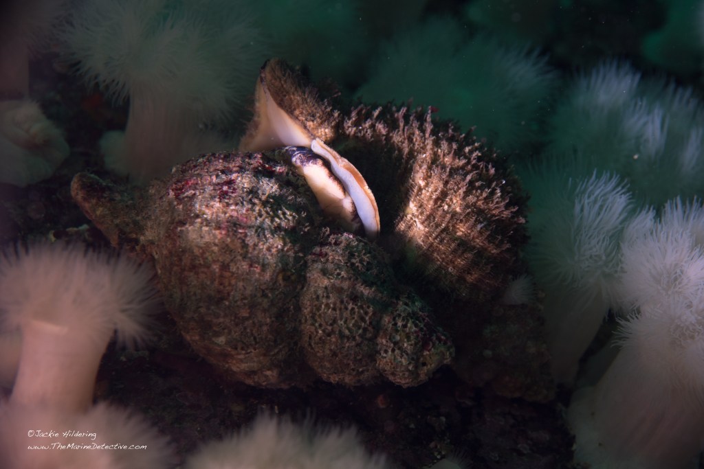 The scientific name for Oregon Tritons is Fusitriton oregonensis. That’s a whole lot of Oregon in their name and the species is the official seashell of Oregon state (there’s trivia for you). However the range for this species is well beyond Oregon. They are found from northern Alaska to northern Mexico, and Japan. They are common around northeast Vancouver Island. Depth range is reported to be from the intertidal to 180 m. In my experience they are rarely in the intertidal however.