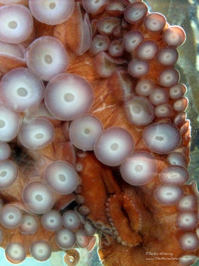 Below is a video of a captive Giant Pacific Octopus named Marylyn shedding her sucker linings (Video source: Christie Rajcic, “Octopus Shedding Suckers”).