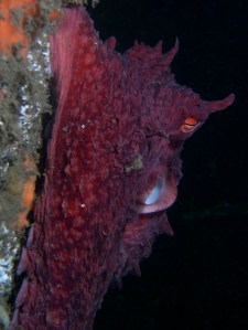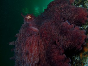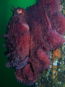 And indeed, under the dock, at only 6 m (20′) we found a Giant Pacific Octopus (Enteroctopus dofleini), curled up on a piling, incredibly tolerant of this ecstatic marine educator. Octopuses are SUCH intelligent animals. I felt as much like I was being scrutinized as he/she must have felt as I observed and photographed this awe-inspiring creature.