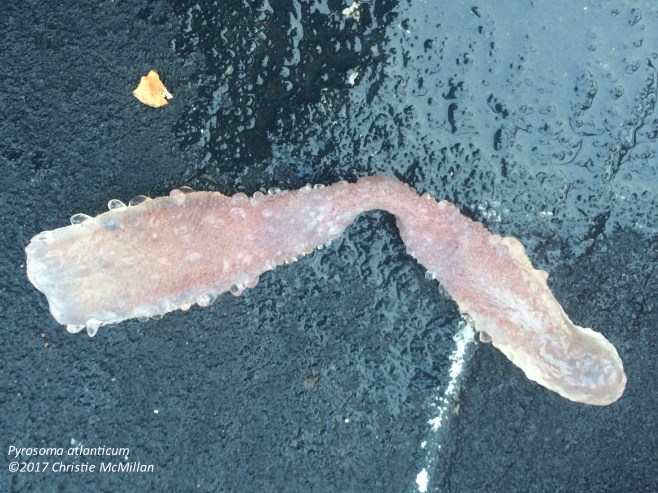 “By the size of the stomach and placement (red/green ball), the shape of the ganglion (the c-shape you can see at opposite end from the stomach) and the short projections along where the individuals are attached to each other; I would say that this is Salpa aspera. These have been washing up on beaches off the west coast of Vancouver Island. . ..