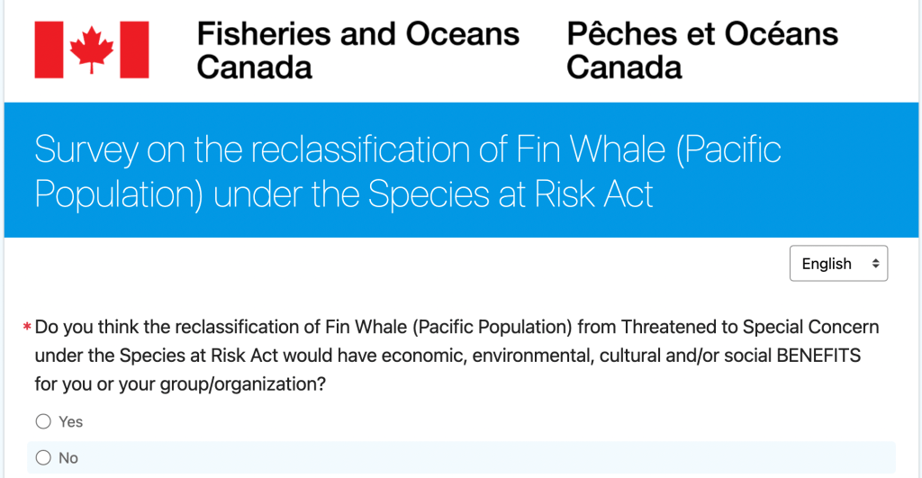 The process determining if the protection of Fin Whales will be reduced in Canada or not involves an opportunity for public comment. This is not a petition. It is using YOUR voice to be part of the federal process that will determine the fate of Fin Whales. The deadline for comment is December 2nd, 2022. It is a short survey.