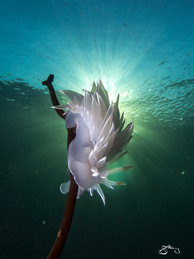 Alabaster Nudibranch on Giant Kelp (horizontal) at only 3 m depth; species to 18 cm. So much beauty, mystery and fragility is hidden just below the surface. ©Jackie Hildering; themarinedetective.ca.