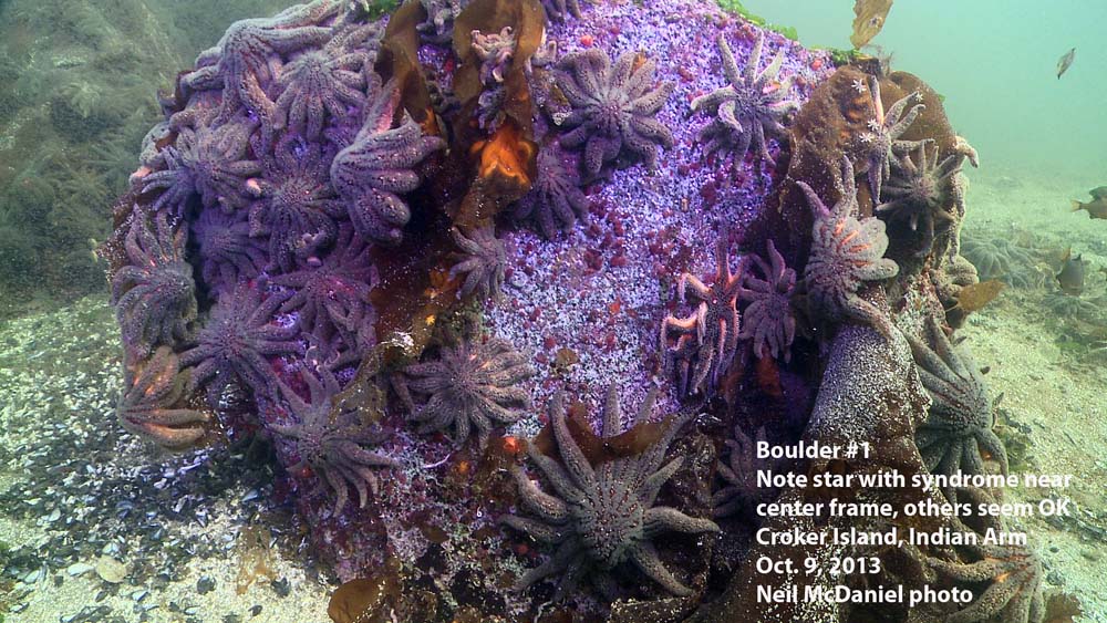 1. In this image most of the Sunflower Stars appear healthy “other than one just right of center frame is exhibiting the syndrome, looking “thinned-out” and emaciated.”