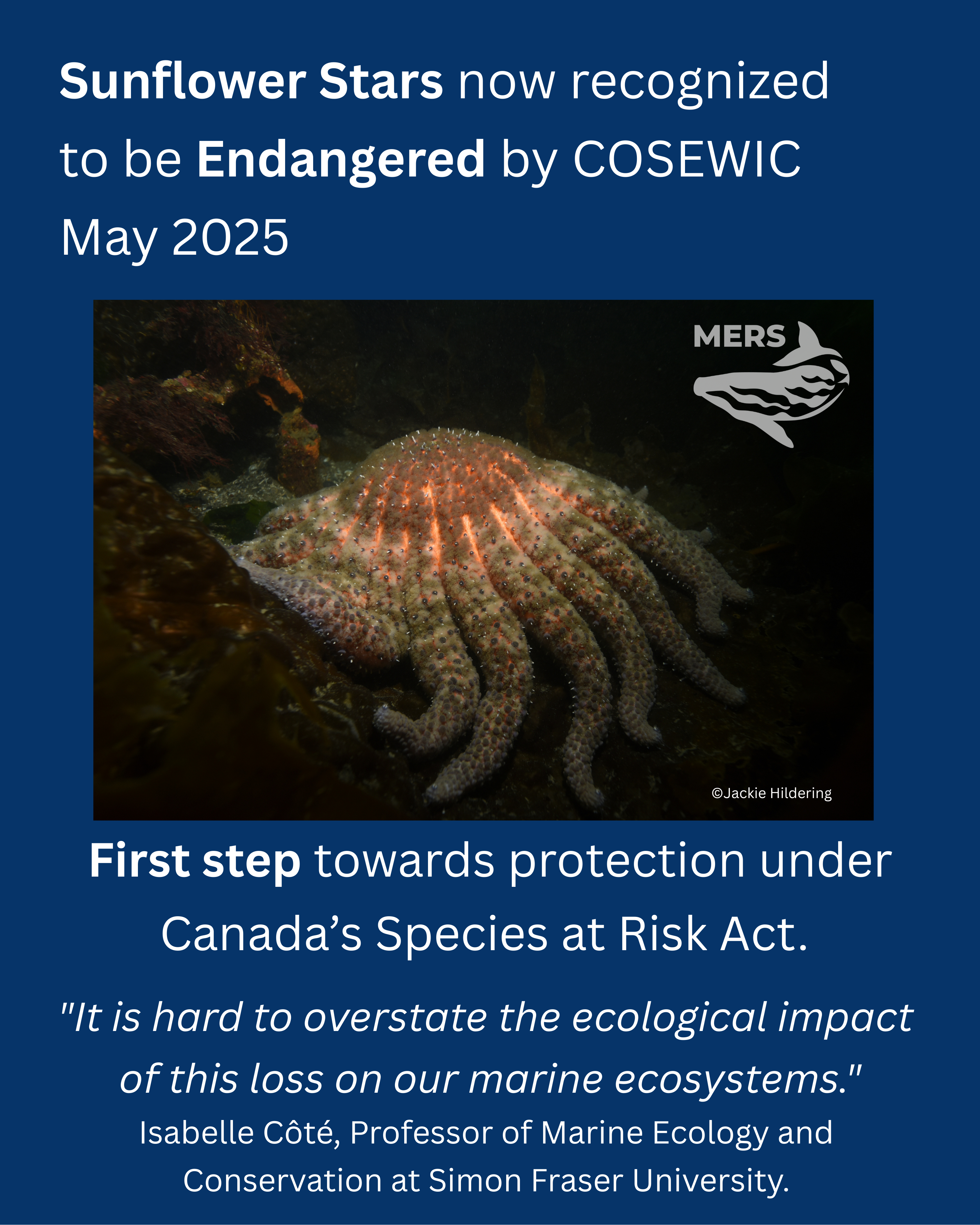 May 15, 2025 – Very important development: The Committee on the Status of Endangered Wildlife in Canada (COSEWIC) is recommending to the Government of Canada that Sunflower Stars be protected as an endangered species under Canada’s Species at Risk Act. This was decided at their May 8, 2025 meeting.