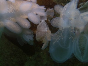 The remarkable-looking animals to the right are Hooded Nudibranchs (Melibe leonina up to 17.5 cm). A nudibranch is subgrouping of sea slugs whose characteristics include having naked (“nudi”) gills (“branchs”).
