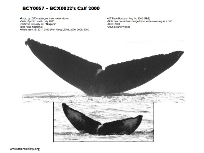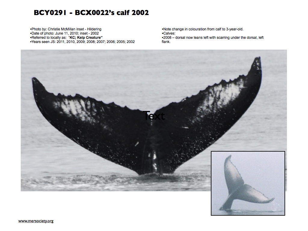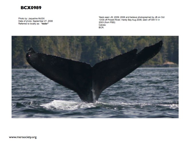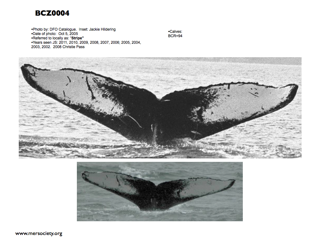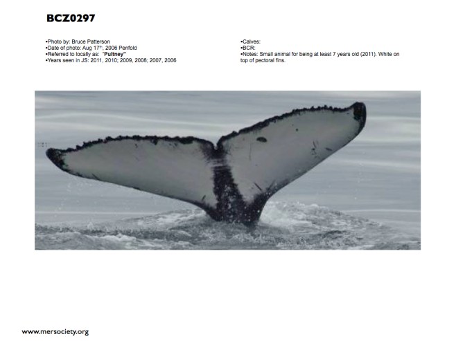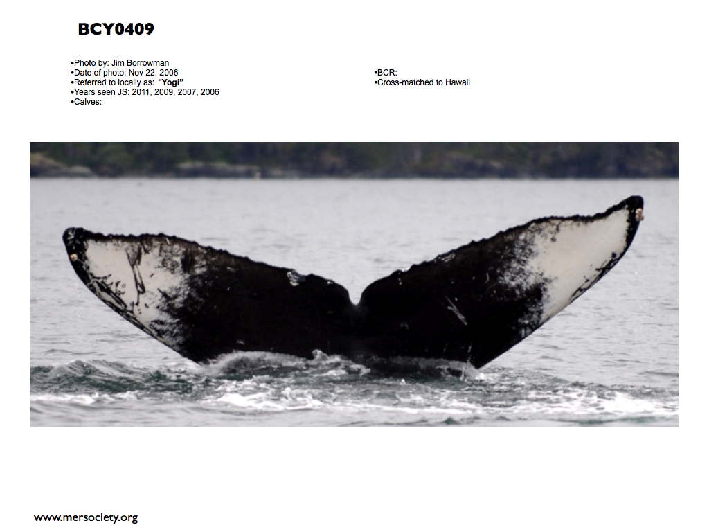 Immediately, I thought of the Humpback Whale BCY0729 who has a marking on his left fluke that looks very much like the letter “A”.