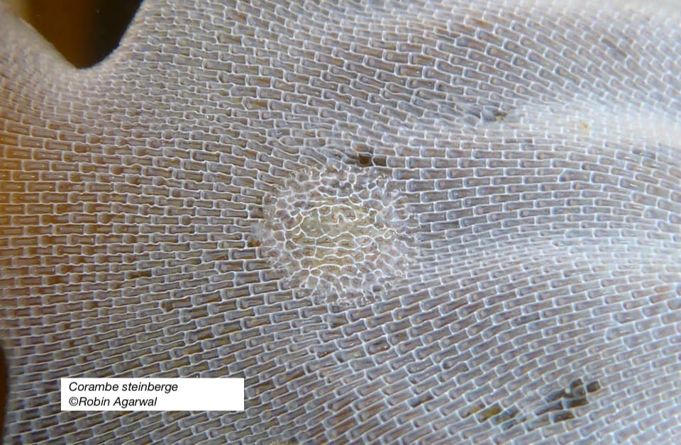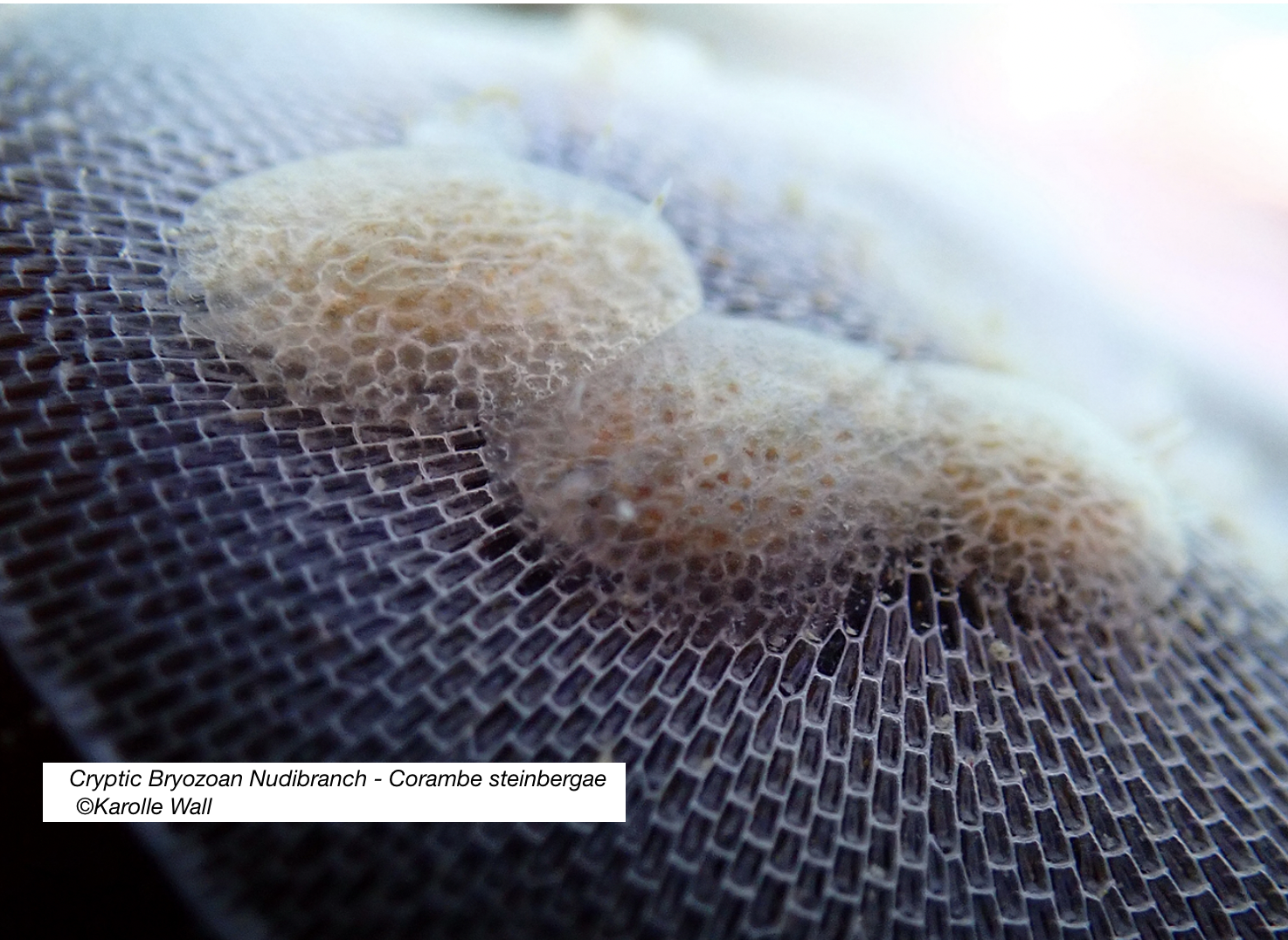 Note there is a second similar looking cryptic nudibranch that can found on these bryozoans and that is Corambe pacifica. Corambe pacifica has a notch at the back. Corambe steinbergae does not.