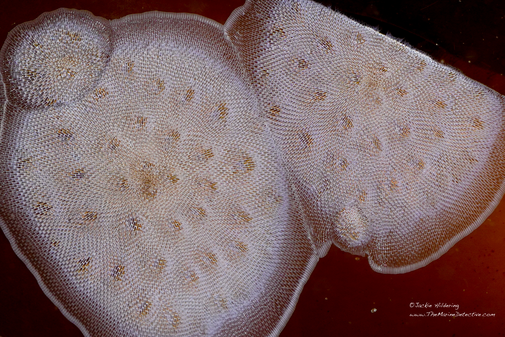 From Beachkeepers: “Bryozoans are colonial animals that arrange themselves in circular (radial) fashion, often with the oldest (and first to settle) individual in the middle. . . . The ‘box’ of the zooid is made of either a tough protein (like what you would find in crab shells) called chitin, or what you would find in coral reefs, calcium carbonate. This body box has an opening where the bryozoans extend their feeding apparatus (that looks a lot like a sea anemone) called a lophophore. Yes, they have predators! [Some species of] nudibranch will eat them, though they can reproduce asexually to form the colony back to size after a nudibranch has been grazing on them. Sometimes, when they grow back, they’ll even grow chitonous spines on their body walls to discourage the nudibranchs from coming back. These spines usually form on the individuals on the outside edge of the colony.”