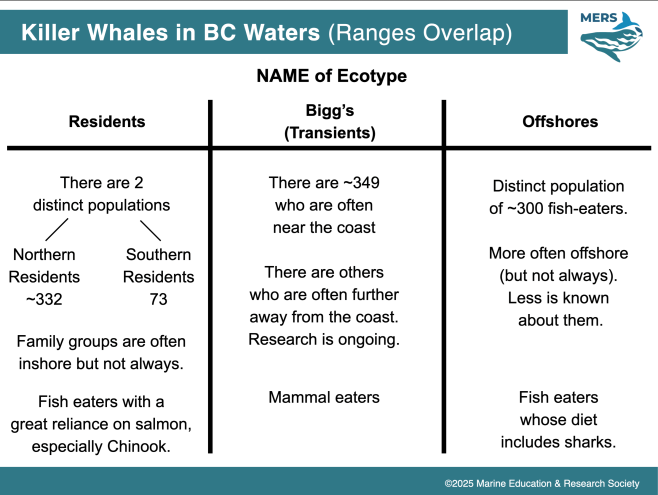 In addition to the N. Residents, the other 3 populations of Orca off the coast of British Columbia are the “Southern Residents” (also inshore fish-eaters; endangered population of 73 whales, August 2019); mammal-eating Bigg’s Killer Whales (aka Transients, threatened population) and offshore fish-eating “Offshores” (threatened population whose diet includes sharks).