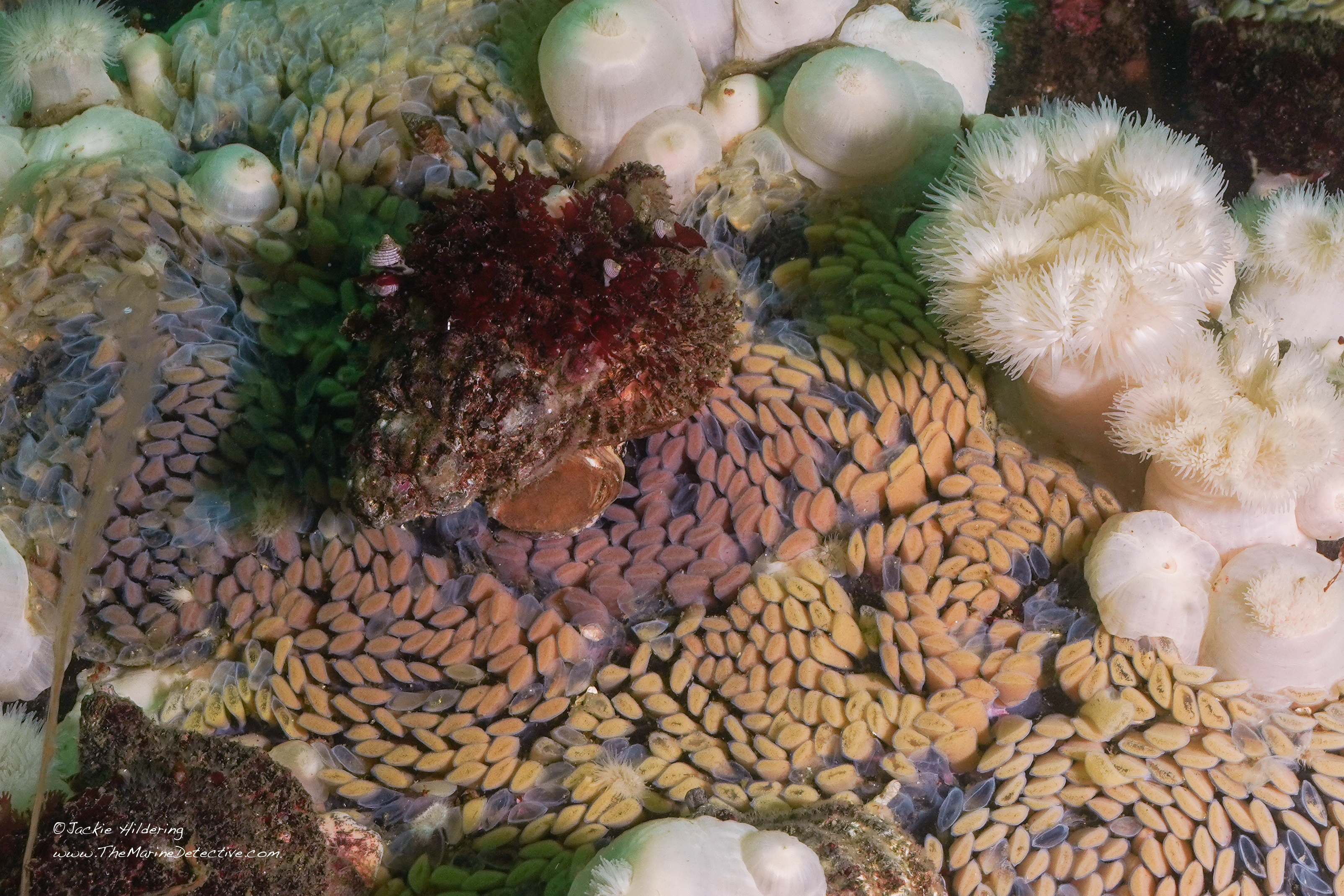I have also seen this species scavenge on dead crabs, anemones and fish and eat Lingcod eggs.