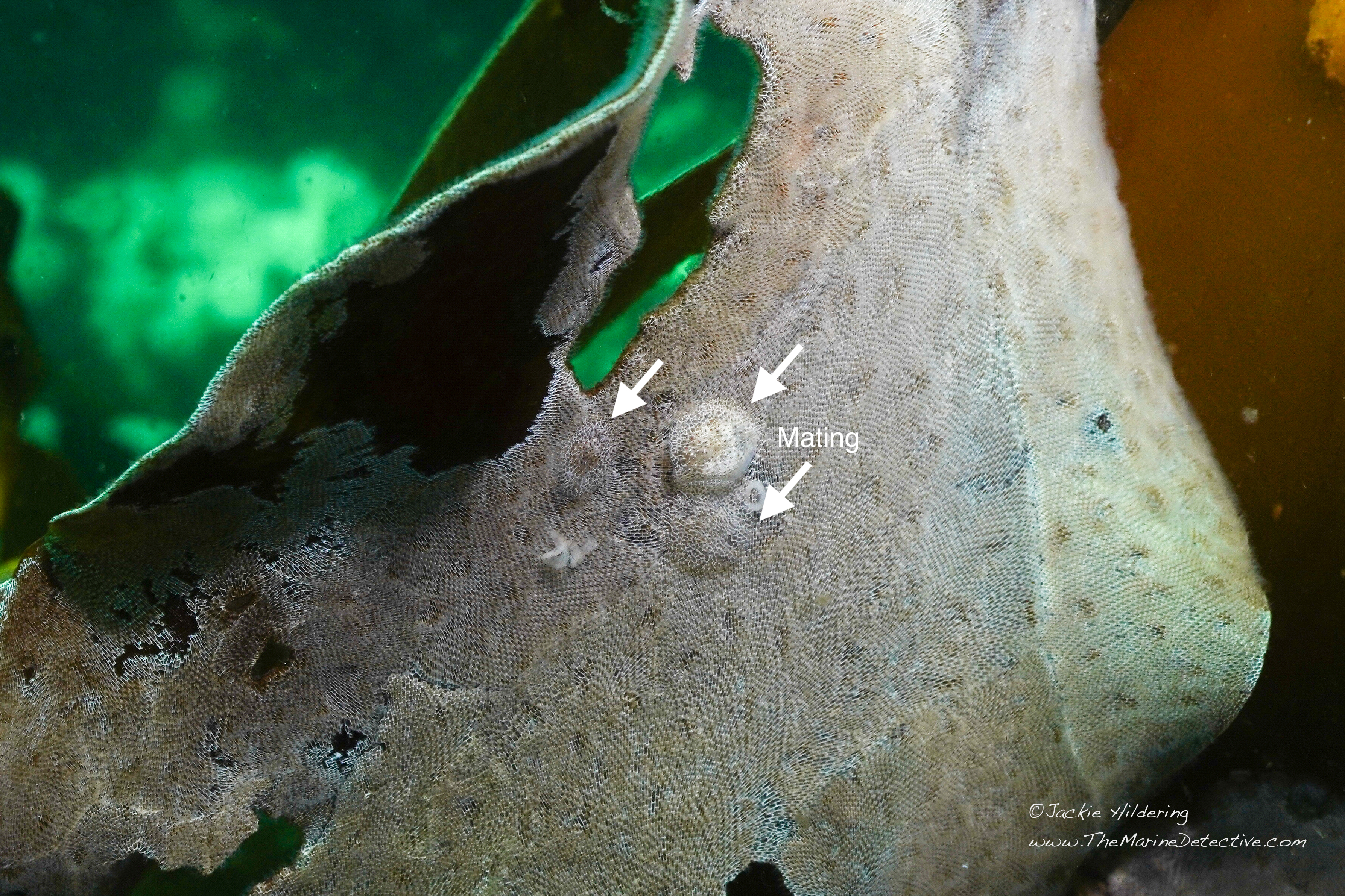 Mating Great White Dorids: Reproduction of nudibranch species is always right-side-to-right-side; attached by structures called “gonophores”. As reciprocal hermaphrodites, both parents become inseminated and lay eggs.