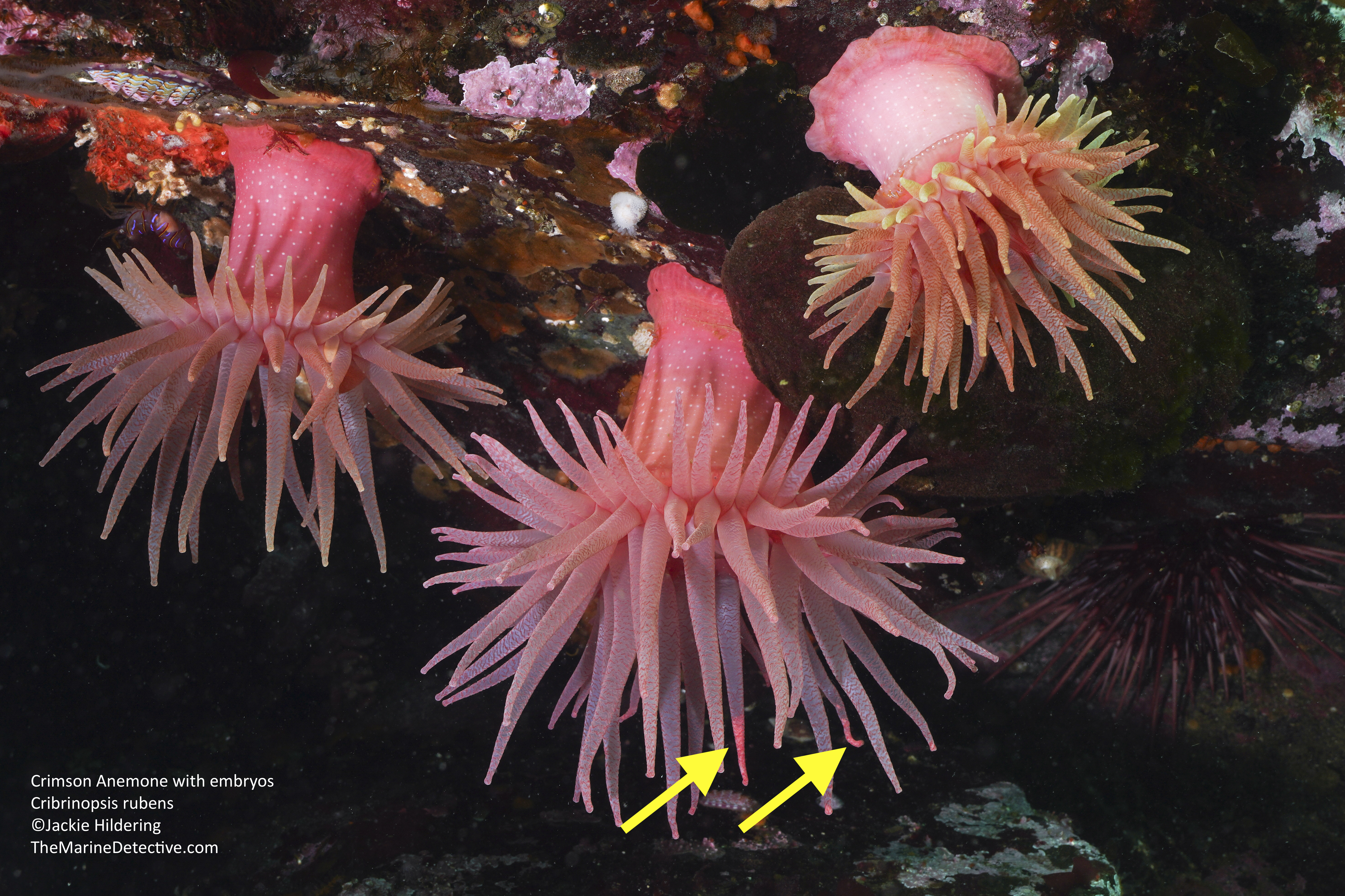Spotted Pink Anemone female with embryos. Male Spotted Pink Anemone spawning.