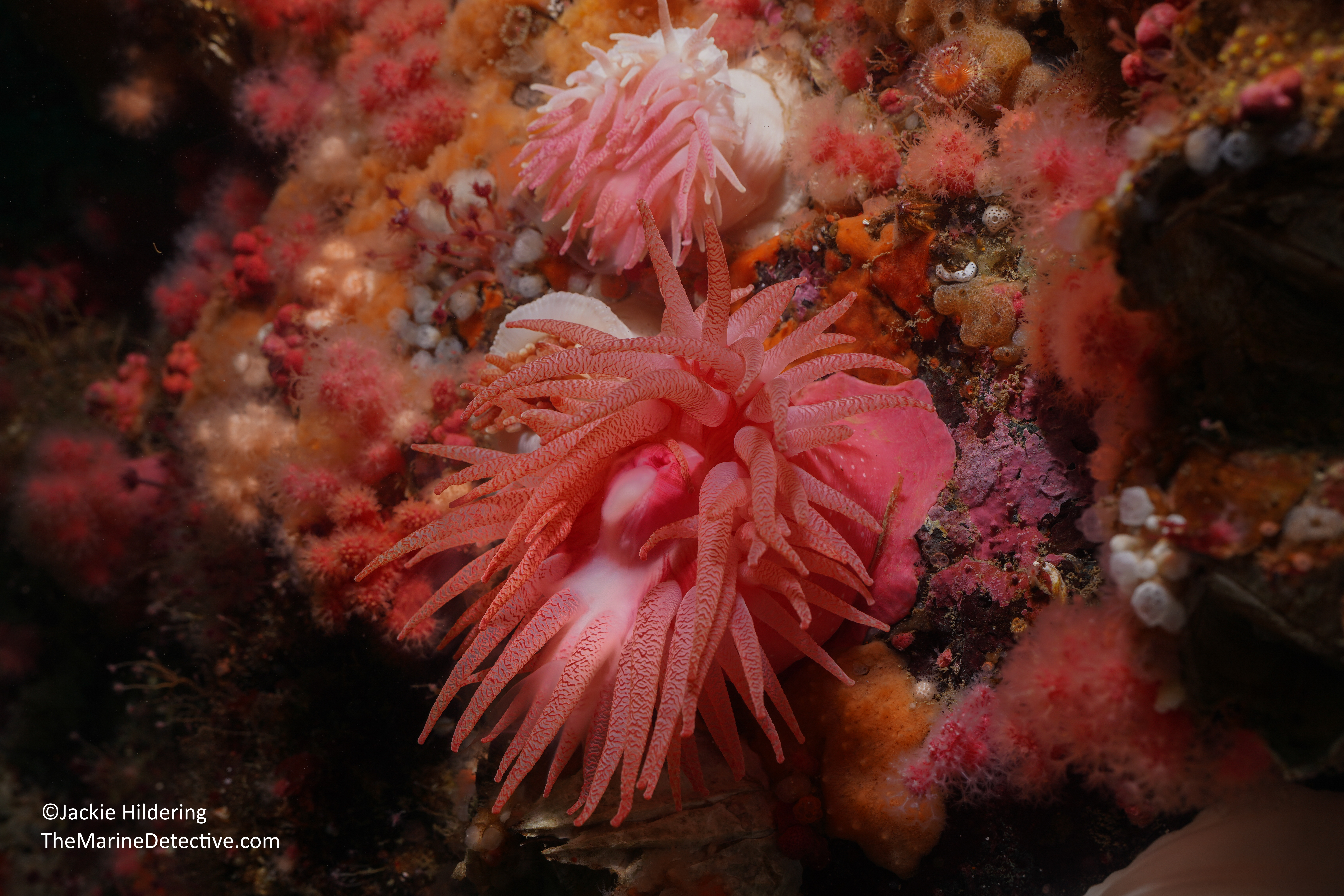 Not only was it the male Orange Sea Cucumbers that were making the cloudy with their astounding numbers of gametes. The Giant Plumose Anemones were broadcast spawning too. Males releasing slow, white jets of their sperm and females then releasing their pinker egg masses. (Note that Giant Plumose Anemones can reproduce asexually as well by pedal laceration but broadcast spawning allows for diversity through sexual reproduction).