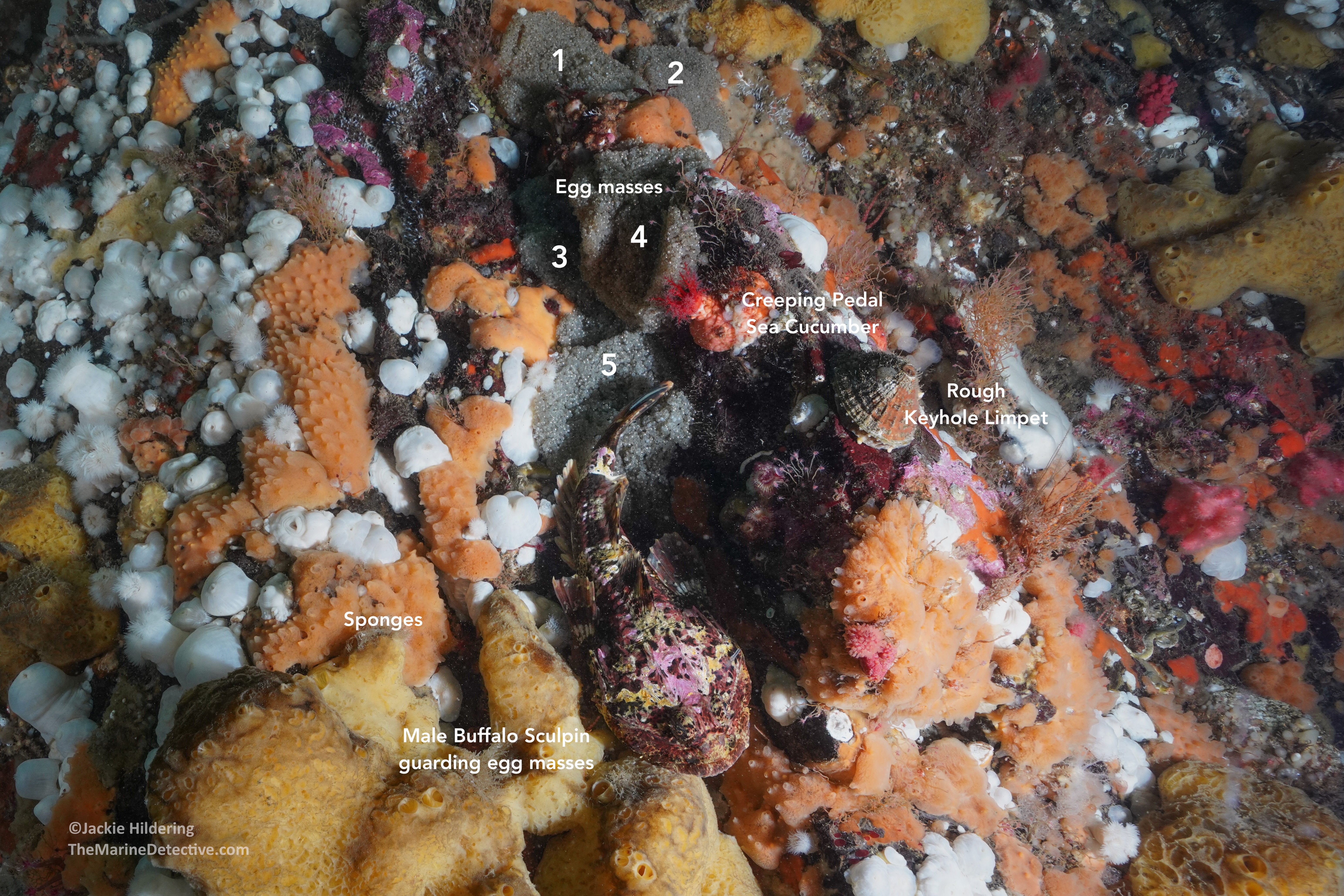 There are Buffalo Sculpin males guarding eggs at this time of year too but more mating appears to be happen in April and May. Usually, Buffalo Sculpins are even harder to spot than their Red Irish Lord cousins but the variably coloured, bright egg masses give away their location. They too have a strategy of staying right atop the eggs and remaining motionless when faced with annoying human divers.