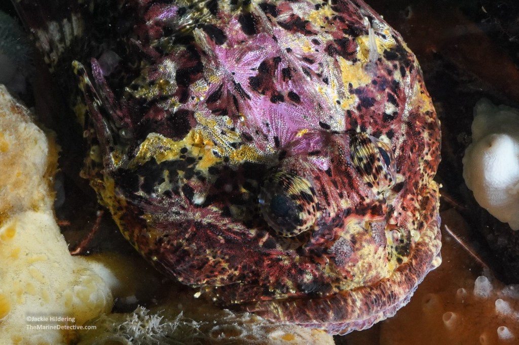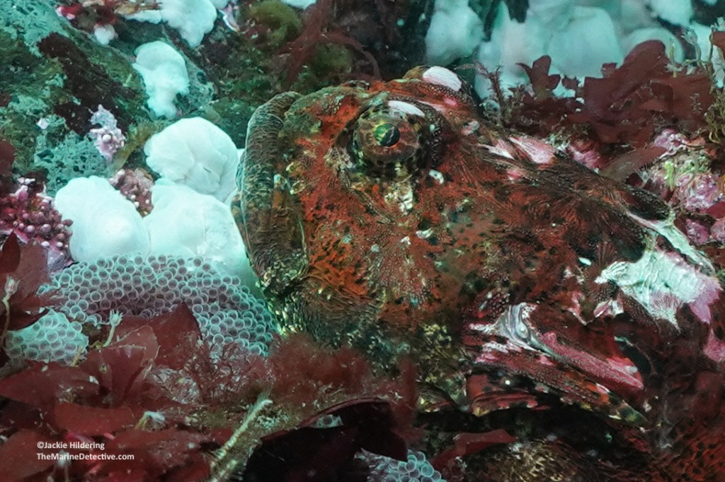 As you can see, Buffalo Sculpins’ red, brown and pink colouration makes them very difficult to discern from the similarly brilliantly coloured life around them. They will remain absolutely still so as not to give away their presence. Their relative, the Red Irish Lord, has the same survival strategy. (See this previous blog item for photos and information on the Red Irish Lord.)