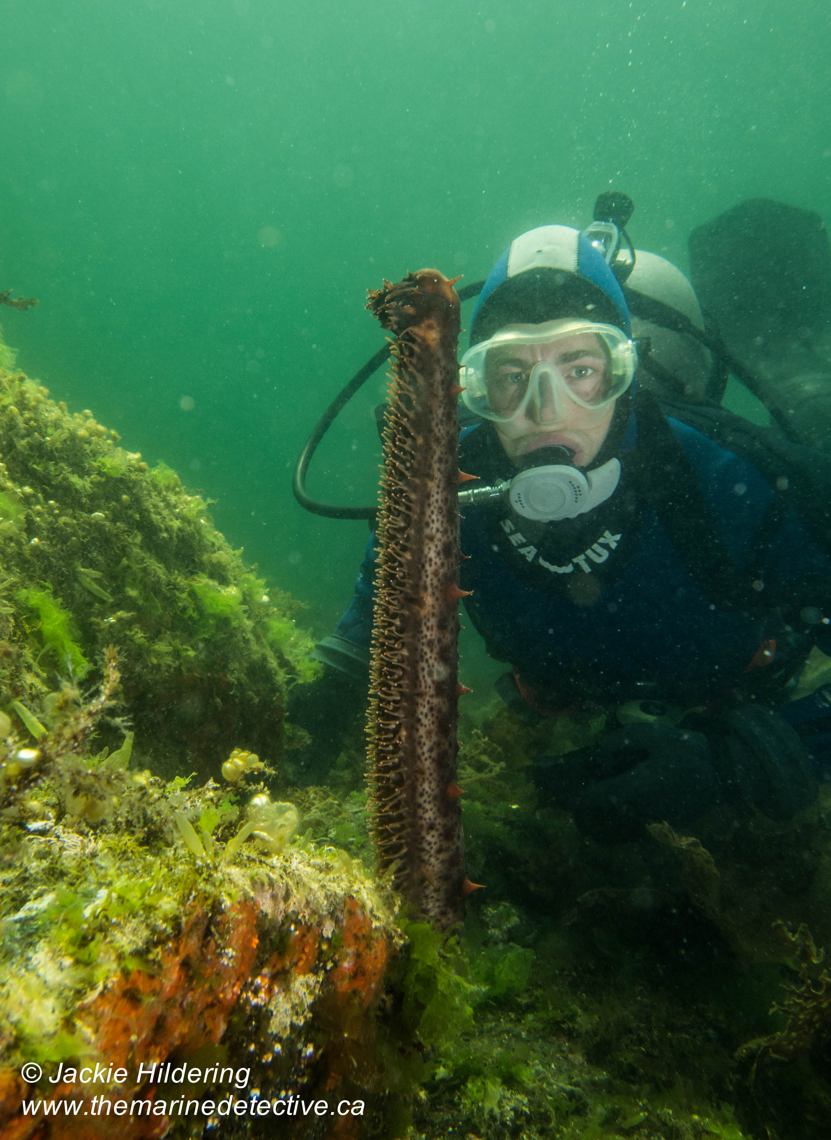 While diving near the Great Bear Rainforest in Jackson Narrows, my buddy Tavish Campbell came upon a Giant Sea Cucumber in this very unusual position (Apostichopus californicus, aka California Sea Cucumber).